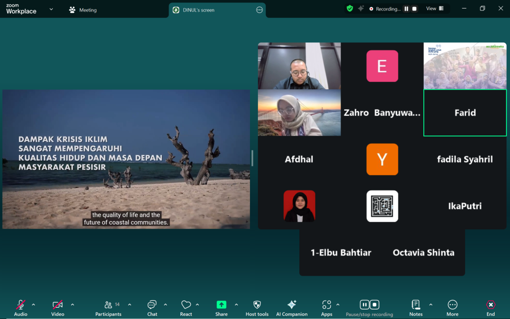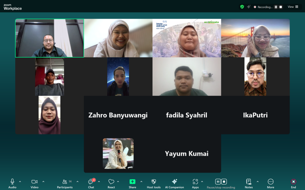 Upaya memperkuat kapasitas pengelolaan program berbasis lingkungan dilakukan melalui kegiatan Sharing Session : Pengalaman Strategi Pengelolaan Program Ecosociopreneurship menuju Keberlanjutan dan Pembentukan Model (Prototipe) yang dilaksanakan pada Senin, 9 Februari 2026, pukul 13.30 WIB hingga selesai melalui ruang Zoom. Kegiatan ini diikuti oleh seluruh pengampu program SMILE (Strengthening Youth Multifaith Leader Initiative on Climate Justice through Ecofeminism).